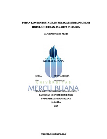 ARDELIA, AUDY (2025) PERAN KONTEN INSTAGRAM SEBAGAI MEDIA PROMOSI HOTEL 1O1 URBAN JAKARTA THAMRIN. D3 thesis, Universitas Mercu Buana Jakarta.