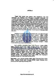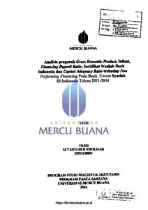 KHOLIFAH, SUTANTI NUR (2016) ANALISI PENGARUH GROSS DOMESTIC PRODUCT, INFLASI, FINANCING DEPOSIT RATIO, SERTIFIKAT WADIAH BANK INDONESIA DAN CAPITAL ADEQUACY RATIO TERHADAP NON PERFORMING FINANCING PADA BANK UMUM SYARIAH DI INDONESIA TAHUN 2011 - 2014. S2 thesis, Universitas Mercu Buana Jakarta.