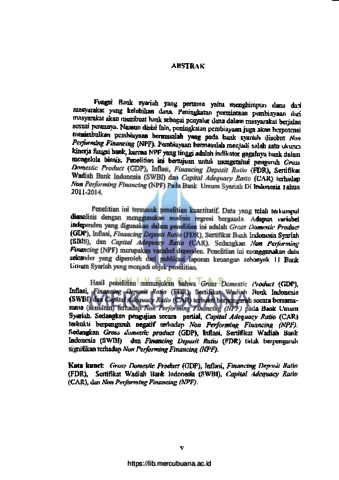 Fungsi Bank syariah yang pertama yaitu menghimpun dana dari masyarakat yang kelebihan dana. Peningkatan permintaan pembiayaan dari masyarakat akan membuat bank sebagai penyalur dana dalam masyarakat berjalan sesuai perannya. Namun disisi lain, peningkatan pembiayaan juga akan berpotensi menimbulkan pembiayaan bermasalah yang pada bank syariah disebut Non Performing Financing (NPF). Pembiayaan bermasalah menjadi salah satu ukuran kinerja fungsi bank, karena NPF yang tinggi adalah indikator gagalnya bank dalam mengelola bisnis. Penelitian ini bertujuan untuk mengetahui pengaruh Gross Domestic Product (GDP), Inflasi, Financing Deposit Ratio (FDR), Sertifikat Wadiah Bank Indonesia (SWBI) dan Capital Adequacy Ratio (CAR) terhadap Non Performing Financing (NPF) Pada Bank Umum Syariah Di Indonesia Tahun 2011-2014. Penelitian ini termasuk penelitian kuantitatif. Data yang telah terkumpul dianalisis dengan menggunakan analisis regresi berganda. Adapun variabel independen yang digunakan dalam penelitian ini adalah Gross Domestic Product (GDP), Inflasi, Financing Deposit Ratio (FDR), Sertifikat Bank Indonesia Syariah (SBIS), dan Capital Adequacy Ratio (CAR). Sedangkan Non Performing Financing (NPF) merupakan variabel dependen. Penelitian ini menggunakan data sekunder yang diperoleh dari publikasi laporan keuangan sebanyak 11 Bank Umum Syariah yang menjadi objek penelitian. Hasil penelitian menunjukan bahwa bahwa Gross Gross Domestic Do Product (GDP), Inflasi, Financing Deposit Ratio (FDR), Sertifikat Wadiah Bank Indonesia (SWBI) dan Capital Adequacy Ratio (CAR) terbukti berpengaruh secara bersama-sama (simultan) terhadap Non Performing Financing (NFF) pada Bank Umum Syariah. Sedangkan pengujian secara partial, Capital Adequacy Ratio (CAR) terbukti berpengaruh negatif terhadap Non Performing Financing (NPF). Sedangkan Gross domestic product (GDP), Inflasi, Sertifikat Wadiah Bank Indonesia (SWBI) dan Financing Deposit Ratio (FDR) tidak berpengaruh signifikan terhadap Non Performing Financing (NPF). Kata kunci: Gross Domestic Product (GDP), Inflasi, Financing Deposit Ratio (FDR), Sertifikat Wadiah Bank Indonesia (SWBI), Capital Adequacy Ratio (CAR), dan Non Performing Financing (NPF).