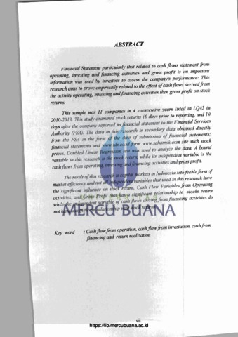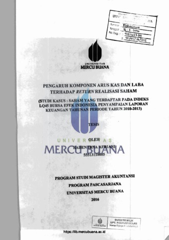 AFRIANI, RADEN IRNA (2016) PENGARUH KOMPONEN ARUS KAS DAN LABA KOTOR TERHADAP RETURN REALISASI SAHAM (STUDI KASUS : SAHAM YANG TERDAFTAR PADA INDEKS LQ45 BURSA EFEK INDONESIA PENYAMPAIAN LAPORAN KEUANGAN TAHUNAN PERIODE TAHUN 2010-2013). S2 thesis, Universitas Mercu Buana Jakarta.