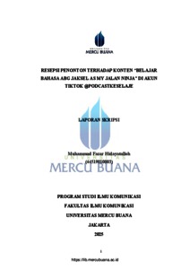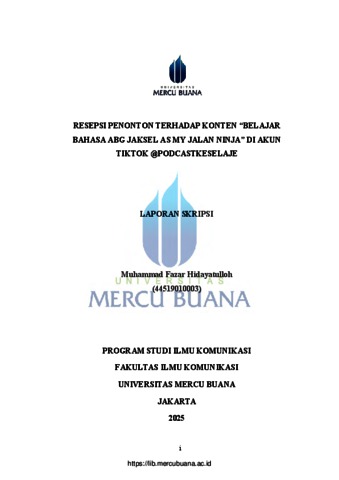 HIDAYATULLOH, MUHAMMAD FAZAR (2025) RESEPSI PENONTON TERHADAP KONTEN "BELAJAR BAHASA ABG JAKSEL AS MY JALAN NINJA" DI AKUN TIKTOK @PODCASTKESELAJE. S1 thesis, Universitas Mercu Buana Jakarta.