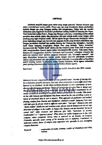 Indonesia menjadi pangsa pasar netter yang sangat potensial. Internet berperan juga dalam merevitalisasi wacana publik. Hanya saja, apa yang dikonstruksi dalam pemberitaan berbeda dengan apa yang dianggap penting oleh penggunanya. Dalam tesis ini, masalah difokuskan pada bagaimana konstruksi pemberitaan tentang konflik di Sampang dan Papua. Teori konstruksi realitas Peter L. Berger dan Thomas Luckmann, memandang realitas sebuah peristiwa akan terlebih dahulu dikonstruksikan oleh para pekerja media sesuai dengan sudut pandang yang ingin ditujukan media. Hal ini sejalan dengan Gamson dan Modigliani bahwa frame dipandang sebagai cara bercerita atau gugusan ide-ide yang tersusun sedemikian rupa. Dengan pendekatan kualtiatif dan analisis framing dari Gamson dan Modigliani, diperoleh hasil: Kasus Sampang diungkapkan dengan frase yang berbeda: "kasus kerusuhan" (kompas.com) dan "konflik Syiah" (detik.com dan vivanews.com). Frase pada kompas.com tidak mengisyaratkan dimensi agama dalam kerusuhan/konflik tersebut. Pada kasus Papua, kompas.com menggunakan depiction "kelompok sipil bersenjata" sedangkan vivanews dan detik.com memberi label "gerakan pengacau keamanan" atau "kelompok separatis". Apa yang ditunjukkan kompas.com tampak sejalan dengan nilai-nilai perusahaan (corporate values) yang diwariskan oleh para pendiri Kompas Gramedia, khususnya nilai caring artinya peduli terhadap sesama. Kesimpulan: dalam konteks Indonesia, faktor agama memainkan peran penting, khususnya dalam kasus yang melibatkan dimensi agama. Kata Kunci : konstruksi realitas, framing, konflik Ahmadiyah dan OPM, internet