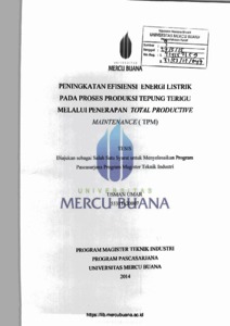 UMAR, USMAN (2014) PENINGKATAN EFISIENSI ENERGI LISTRIK PADA PROSES PRODUKSI TEPUNG TERIGU MELALUI PENERAPAN TOTAL PRODUCTIVE MAINTENANCE (TPM). S2 thesis, Universitas Mercu Buana Jakarta.