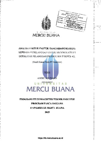 AGUSMAN, ANDRI (2015) ANALISA FAKTOR-FAKTOR YANG MEMPENGARUH KEPUASAAN PELANGGAN UNTUK MENINGKATKAN LOYALITAS PELANGGAN PRODUK BOLT SUPER 4G (Studi Kasus Pada PT Internux). S2 thesis, Universitas Mercu Buana Jakarta.