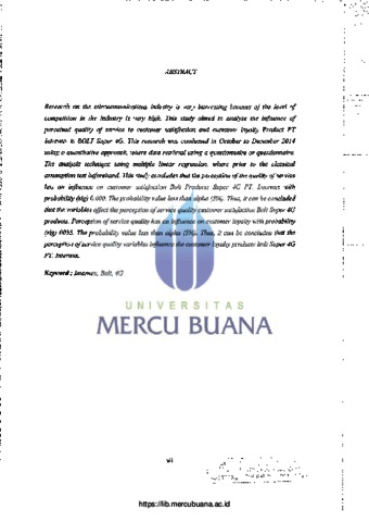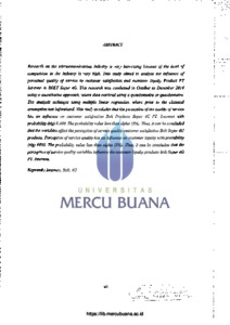 Penelitian tentang industri telekomunikasi sangat menarik karena tingkat persaingan di industri tersebut sangat tinggi. Penelitian ini bertujuan untuk menganalisis pengaruh persepsi kualitas layanan terhadap kepuasaan pelanggan dan loyalitas pelanggan Produk PT Internux yaitu BOLT Super 4G. Penelitian ini dilakukan pada bulan Oktober sampai bulan Desember 2014 menggunakan pendekatan kuantitatif, dimana pengambilan data menggunakan kuesioner atau angket. Adapun teknik analisis nya menggunakan regresi linear berganda, dimana sebelum dilakukan dilakukan uji asumsi klasik terlebih dahulu. Penelitian ini memberikan kesimpulan bahwa Persepsi kualitas layanan memiliki pengaruh terhadap kepuasan pelanggan Produk Bolt Super 4G PT. Internux dengan nilai probabilitas (nilai sig) 0.000. Nilai probabilitas tersebut lebih kecil dari alpa (5%). Dengan demikian, dapat disimpulkan bahwa variabel persepsi kualitas layanan berpengaruh terhadap kepuasan pelanggan produk Bolt Super 4G. Persepsi kualitas layanan memiliki pengaruh terhadap loyalitas pelanggan dengan nilai probabilitas (nilai sig) 0.035. Nilai probabilitas tersebut lebih kecil dari alpa (5%). Dengan demikian, dapat disimpulkan bahwa variabel persepsi kualitas layanan berpengaruh terhadap loyalitas pelanggan produk Bolt Super 4G PT. Internux. Kata Kunci: Internux, Bolt, 4G