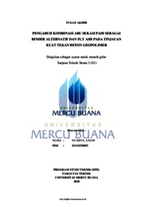 ANAM, SYAIFUL (2018) PENGARUH KOMBINASI ABU SEKAM PADI SEBAGAI BINDER ALTERNATIF DAN FLY ASH PADA TINJAUAN KUAT TEKAN BETON GEOPOLIMER. S1 thesis, UNIVERSITAS MERCU BUANA - BUNCIT.