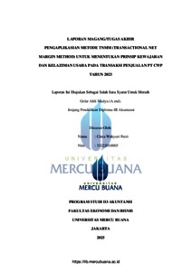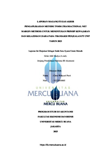 PUTRI, CINTA WAHYURI (2025) PENGAPLIKASIAN METODE TNMM (TRANSACTIONAL NET MARGIN METHOD) UNTUK MENENTUKAN PRINSIP KEWAJARAN DAN KELAZIMAN USAHA PADA TRANSAKSI PENJUALAN PT CWP TAHUN 2023. D3 thesis, Universitas Mercu Buana Jakarta.