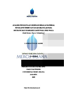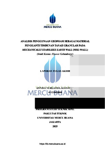 AGUSTINA, ANNISA NURLATIFA (2025) ANALISIS PENGGUNAAN GEOFOAM SEBAGAI MATERIAL PENGGANTI TIMBUNAN TANAH GRANULAR PADA MECHANICALLY STABILIZES EARTH WALL (MSE-WALL) (Studi Kasus : Flyover Gelombang). S1 thesis, Universitas Mercu Buana Jakarta.
