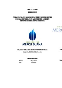 The design of the Modern Islamic Boarding School for Girls in Gading Serpong successfully addresses the contemporary needs of Islamic education. By applying a modern architectural approach, the building emphasizes functionality, simplicity of form, spatial efficiency, and the use of advanced materials and technologies. The incorporation of feminist architectural principles ensures the creation of spaces that are safe, inclusive, and empowering forfemale students, in line with gender equality values in education. The design also integrates sustainability aspects—ecological, social, and economic—to provide a healthy, comfortable learning environment that is connected to the surrounding community. In conclusion, this design approach, which harmonizes traditional Islamic values with modern architectural and genderresponsive principles, results in an educational facility that is not only religious but also progressive and contextually relevant. Keywords : Islamic Boarding School, Modern Feminine Architecture, Traditional and Modern Perancangan Pondok Pesantren Modern Putri di Gading Serpong berhasil merespons kebutuhan pendidikan Islam yang relevan dengan perkembangan zaman. Melalui pendekatan arsitektur modern, bangunan dirancang dengan mengutamakan fungsi, kesederhanaan bentuk, efisiensi ruang, dan pemanfaatan teknologi serta material terkini. Penerapan prinsip arsitektur feminisme dalam desain menciptakan ruang yang aman, inklusif, dan memberdayakan santri putri, sejalan dengan nilai-nilai kesetaraan gender dalam pendidikan. Perancangan ini juga mempertimbangkan aspek keberlanjutan, baik dari sisi ekologis, sosial, maupun ekonomi, untuk menciptakan lingkungan belajar yang sehat, nyaman, dan terintegrasi dengan komunitas sekitar. Kesimpulannya, pendekatan perancangan yang menyinergikan nilai tradisional dan modern, serta mengakomodasi kebutuhan gender, mampu menghasilkan pondok pesantren yang tidak hanya religius, tetapi juga progresif dan kontekstual terhadap lingkungan masa kini. Kata Kunci : Pondok Pesantren, Arsitektur Modern Feminim, Tradisional dan Modern