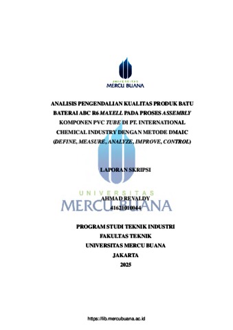 REVALDY, AHMAD (2025) ANALISIS PENGENDALIAN KUALITAS PRODUK BATU BATERAI ABC R6 MAXELL PADA PROSES ASSEMBLY KOMPONEN PVC TUBE DI PT. INTERNATIONAL CHEMICAL INDUSTRY DENGAN METODE DMAIC (DEFINE, MEASURE, ANALYZE, IMPROVE, CONTROL). S1 thesis, Universitas Mercu Buana Jakarta.