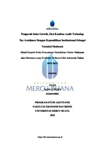 PUSPA, NADILA (2025) PENGARUH SALES GROWTH, DAN KUALITAS AUDIT TERHADAP TAX AVOIDANCE DENGAN KEPEMILIKAN INSTITUSIONAL SEBAGAI VARIABEL MODERASI (Studi Empiris Pada Perusahaan Manufaktur Sektor Makanan dan Minuman yang Terdaftar Di Bursa Efek Indonesia Tahun 2019-2023). S1 thesis, Universitas Mercu Buana Jakarta.