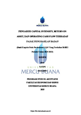YATINI, YATINI (2025) PENGARUH CAPITAL INTENSITY, RETURN ON ASSET, DAN OPERATING CASH FLOW TERHADAP PAJAK PENGHASILAN BADAN (Studi Empiris Pada Perusahaan LQ45 Yang Terdaftar Di BEI Periode Tahun 2019-2023). S1 thesis, Universitas Mercu Buana Jakarta.