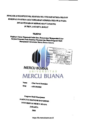 HAMIDAH, EKA NURUL (2018) PENGARUH KOMPETENSI, KERJASAMA TIM DAN KESELAMATAN KESEHATAN KERJA (K3) TERHADAP KINERJA PEGAWAI PADA DINAS PEMADAM KEBAKARAN TANJUNG DUREN, JAKARTA BARAT. S1 thesis, Universitas Mercu Buana Jakarta.