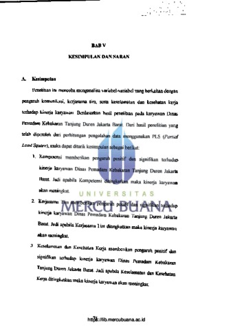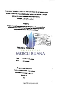 ABSTRAK Penelitian ini untuk mengetahui pengaruh kompetensi, kerjasama tim, keselamtan dan kesehatan kerja terhadap kinerja pegawai. Objek penelitian ini adalah seluruh pegawai Dinas Pemadam Kebakaran Tanjung Duren Jakarta Barat berjumlah 100 pegawai. Penelitian ini menggunakan non probability sampling. Pengambilan data dilakukan dengan cara menyebar kuesioner penelitian kepada responden dilokasi penelitian. Data yang diperoleh dianalisis menggunakan Partial Least Squares (PLS). Hasil penelitian menunjukan bahwa Kompetensi berpengaruh positif signifikan terhadap Kinerja Pegawai Dinas Pemadam Kebakaran Tanjung Duren Jakarta Barat. Kerjasama Tim berpengaruh positif signifikan terhadap Kinerja Pegawai Dinas Kebakaran Tanjung Duren Jakarta Barat. Keselamatan dan Kesehatan Kerja berpengaruh positif signifikan terhadap Kinerja Pegawai Dinas Pemadam Kebakaran Tanjung Duren Jakarta Barat. Kata Kunci: Kompetensi, Kerjasama Tim, Keselamatan dan Kesehatan Kerja (K3), Kinerja Pegawai