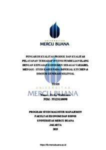 WIDHIANTO, DICKY (2025) PENGARUH KUALITAS PRODUK DAN KUALITAS PELAYANAN TERHADAP INTENSI PEMBELIAN ULANG DENGAN KEPUASAN KONSUMEN SEBAGAI VARIABEL MEDIASI : STUDI KASUS PADA IMPERIAL KITCHEN & DIMSUM GENERASI MILENIAL. S2 thesis, Universitas Mercu Buana Jakarta.