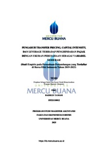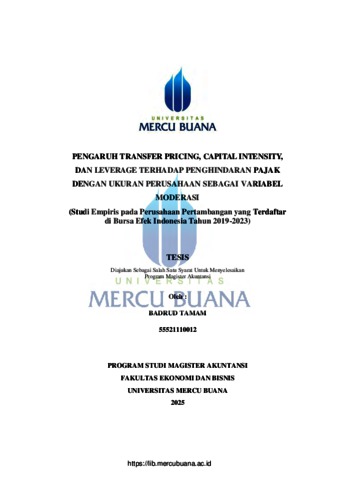 TAMAM, BADRUD (2025) PENGARUH TRANSFER PRICING, CAPITAL INTENSITY, DAN LEVERAGE TERHADAP PENGHINDARAN PAJAK DENGAN UKURAN PERUSAHAAN SEBAGAI VARIABEL MODERASI (Studi Empiris pada Perusahaan Pertambangan yang Terdaftar di Bursa Efek Indonesia Tahun 2019-2023). S2 thesis, Universitas Mercu Buana Jakarta.