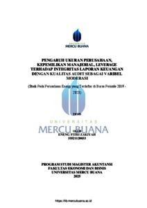 This study aims to determine the effect of company size, managerial ownership, and leverage on financial statement integrity with audit quality as a moderating variable. The data used in this study are energy sector companies listed on the Indonesia Stock Exchange (IDX) during the period 2019–2023. The analysis methods used are Panel Data Regression and Moderated Regression Analysis. The results of the study indicate that company size has a negative and significant effect on financial statement integrity, managerial ownership has a positive and significant effect on financial statement integrity, and leverage has no effect on financial statement integrity. Additionally, the moderation test results indicate that Audit Quality weakens the relationship between company size and financial statement integrity, Audit Quality strengthens the relationship between managerial ownership and financial statement integrity, and Audit Quality does not moderate the effect of leverage on financial statement integrity. This study provides implications for companies to increase managerial ownership and pay attention to risk factors in financial reporting. Additionally, the results of this study can also serve as a reference for further research in developing more complex models by adding other variables that may influence financial statement integrity Keywords : Firm Size, Managerial Ownership, Leverage, Financial Statement Integrity, Audit Quality, Penelitian ini bertujuan untuk mengetahui pengaruh ukuran perusahaan, kepemilikan manajerial, dan leverage terhadap integritas laporan keuangan dengan kualitas audit sebagai variabel moderasi. Data yang digunakan dalam penelitian ini adalah perusahaan sektor energi yang terdaftar di Bursa Efek Indonesia (BEI) selama periode 2019 – 2023. Metode analisis yang digunakan adalah Regresi Data Panel dan Moderated Regression Analysis. Hasil penelitian menunjukkan bahwa Ukuran Perusahaan memiliki pengaruh negatif dan signifikan terhadap integritas laporan keuangan, Kepemilikan Manajerial berpengaruh positif dan signifikan terhadap integritas laporan keuangan, leverage tidak berpengaruh terhadap integritas laporan keuangan. Selain itu, hasil uji moderasi menunjukkan bahwa Kualitas audit memperlemah hubungan antara ukuran perusahaan terhadap integritas laporan keuangan, Kualitas audit memperkuat hubungan kepemilikan manajerial terhadap Integritas Laporan Keuangan, Kualitas audit tidak mampu memoderasi pengaruh leverage terhadap integritas laporan keuangan. Penelitian ini memberikan implikasi bagi perusahaan untuk meningkatkan kepemilikan manajerial dan memperhatikan faktor risiko dalam pelaporan keuangan. Selain itu, hasil penelitian ini juga dapat menjadi referensi bagi penelitian selanjutnya dalam mengembangkan model yang lebih kompleks dengan menambahkan variabel lain yang dapat mempengaruhi integritas laporan keuangan. Kata Kunci : Ukuran Perusahaan, Kepemilikan Manajerial, Leverage, Integritas Laporan Keuangan, Kualitas Audit.