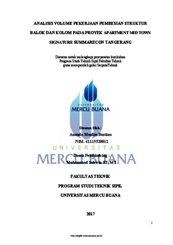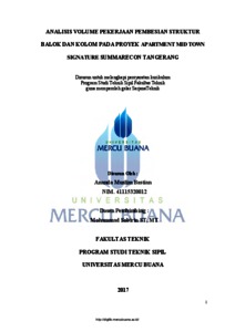 BASTIAN, ANANDA MUSLIM (2017) ANALISIS VOLUME PEKERJAAN PEMBESIAN STRUKTUR BALOK DAN KOLOM PADA PROYEK APARTMENT MID TOWN SIGNATURE SUMMARECON TANGERANG. S1 thesis, UNIVERISTAS MERCU BUANA - BUNCIT.