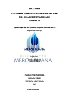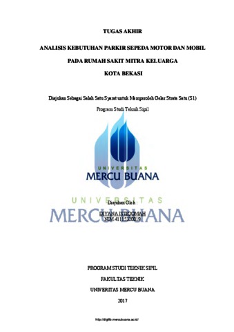 ISTIQOMAH, DIYANA (2017) ANALISIS KEBUTUHAN PARKIR SEPEDA MOTOR DAN MOBIL PADA RUMAH SAKIT MITRA KELUARGA KOTA BEKASI. S1 thesis, UNIVERISTAS MERCU BUANA - BUNCIT.
