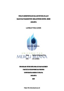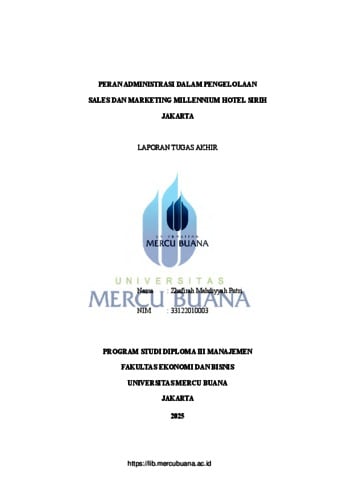 PUTRI, ZHAFIRAH MAHDIYYAH (2025) PERAN ADMINISTRASI DALAM PENGELOLAAN SALES DAN MARKETING MILLENNIUM HOTEL SIRIH JAKARTA. D3 thesis, Universitas Mercu Buana Jakarta.