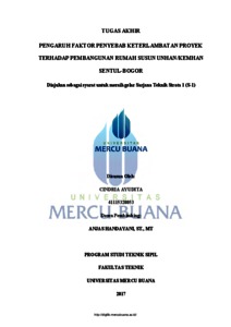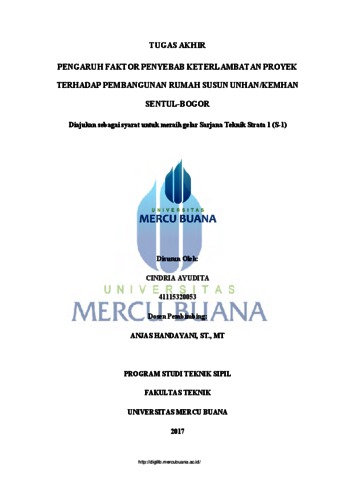 AYUDITA, CINDRIA (2017) PENGARUH FAKTOR PENYEBAB KETERLAMBATAN PROYEK TERHADAP PEMBANGUNAN RUMAH SUSUN UNHAN/KEMHAN SENTUL-BOGOR. S1 thesis, UNIVERISTAS MERCU BUANA - BUNCIT.