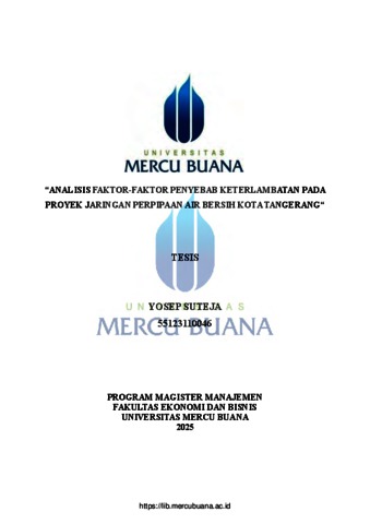 SUTEJA, YOSEP (2025) "ANALISIS FAKTOR-FAKTOR PENYEBAB KETERLAMBATAN PADA PROYEK JARINGAN PERPIPAAN AIR BERSIH KOTA TANGERANG". S2 thesis, Universitas Mercu Buana Jakarta.