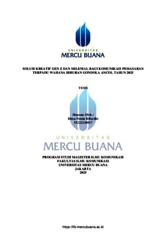 RIFARDHI, BIMA PETALA (2025) SOLUSI KREATIF GEN Z DAN MILENIAL BAGI KOMUNIKASI PEMASARAN TERPADU WAHANA HIBURAN GONDOLA ANCOL TAHUN 2025. S2 thesis, Universitas Mercu Buana Jakarta.