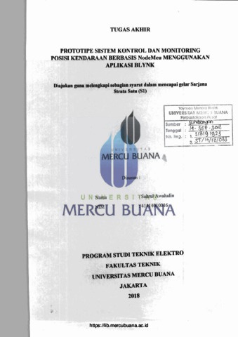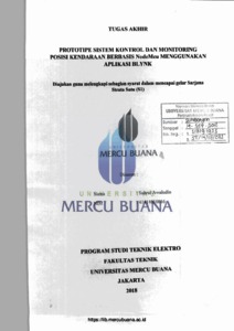 AWALUDIN, SAHRUL (2018) PROTOTIPE SISTEM KONTROL DAN MONITORING POSISI KENDARAAN BERBASIS NodeMcu MENGGUNAKAN APLIKASI BLYNK. S1 thesis, Universitas Mercu Buana Jakarta.