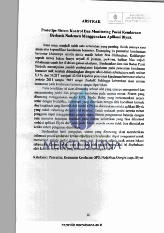 Prototipe Sistem Kontrol Dan Monitoring Posisi Kendaraan Berbasis Nodemcu Menggunakan Aplikasi Blynk Rasa aman menjadi salah satu kebutuhan yang penting. Salah satunya rasa aman atas kepemilikan kendaraan bermotor. Disamping itu pencurian kendaraaan bermotor khususnya sepeda motor masih belum bisa dihilangkan. Kehilangan sepeda motor bukan hanya terjadi di jalanan, parkiran, bahkan bisa terjadi dihalaman rumah dan di dalam garasi sekalipun. Berdasarkan data dari Badan Pusat Statistik menunjukan jumlah peningkatan kejahatan pada pencurian kendaraan bermotor naik kembali dibandingkan dengan tahun-tahun sebelumnya naik sekitar 8,3% dari 39.217 menjadi 42.508 kejadian pencurian kendaraan bermotor selama periode 2011 sampai 2015 sangat fluaktif. Sehingga kebutuhan akan sistem keamanan pada kendaraan bermotor sangat diperlukan. Pada penelitian ini akan dirancang sebuah alat yang mampu mengontrol dan memonitoring posisi dan pengaman tambahan pada sepeda motor. Sistem yang dirancang menggunakan modul GPS, Modul Relay yang berkomunkasi secara serial dengan NodeMcu. Informasi yang diberikan berupa titik koordinat latitude dan longtitude yang diambil oleh modul GPS dan dikirimkan melalui aplikasi Blynk yang sudah terhubung dengan alat tersebut. Untuk melacak posisi sepeda motor pengguna dapat menggunakan google maps. Sistem pengamanan bekerja dengan cara memutus tegangan masukan pada sistem kelistrikan yang bisa dikontrol melalui aplikasi Blynk dari jarak jauh. Mesin sepeda motor tidak bisa dinyalakan ketika sistem pengaman diaktifkan. Berdasarkan hasil pengujian, sistem yang dirancang akan memberikan informasi posisi kendaraan ketika terjadinya pencurian dan dapat mengontrol untuk mematikan sepeda motor dengan jarak jauh. Terdapat selisih jarak antara lokasi sebenarnya dengan lokasi yang ditujukan oleh google murs Hal ini disebabkan oleh kualitas sinyal GPS yang diterima oleh peringkat GPS. Kata kunci: Pencurian, Keamanan Kendaraan GPS, NodeMcu, Google maps, Blynk