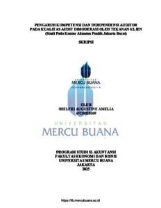AMELIA, SHELFRI AUGUSTINE (2025) PENGARUH KOMPETENSI DAN INDEPENDENSI AUDITOR PADA KUALITAS AUDIT DIMODERASI OLEH TEKANAN KLIEN (Studi Pada Kantor Akuntan Punlik Jakarta Barat). S1 thesis, Universitas Mercu Buana Jakarta.