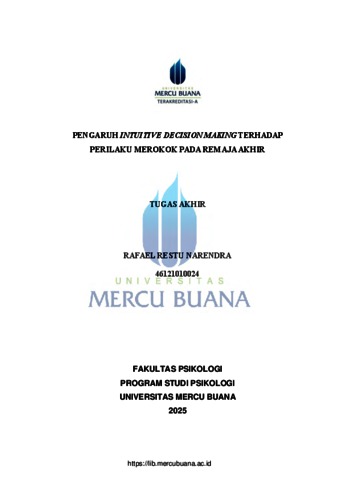 NARENDRA, RAFAEL RESTU (2025) PENGARUH INTUITIVE DECISION MAKING TERHADAP PERILAKU MEROKOK PADA REMAJA AKHIR. S1 thesis, Universitas Mercu Buana Jakarta.