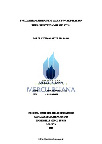 SIREGAR, APRIALDO (2025) EVALUASI MANAJEMEN EVENT DALAM PUNCAK PERAYAAN HUT KABUPATEN TANGERANG KE 392. D3 thesis, Universitas Mercu Buana Jakarta.