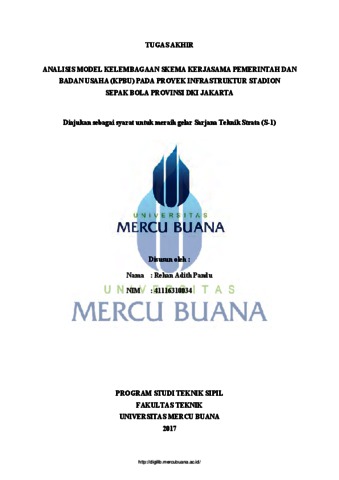PANDU, REHAN ADITH (2018) ANALISIS MODEL KELEMBAGAAN SKEMA KERJASAMA PEMERINTAH DAN BADAN USAHA (KPBU) PADA PROYEK INFRASTRUKTUR STADION SEPAK BOLA PROVINSI DKI JAKARTA. S1 thesis, UNIVERISTAS MERCU BUANA - BUNCIT.