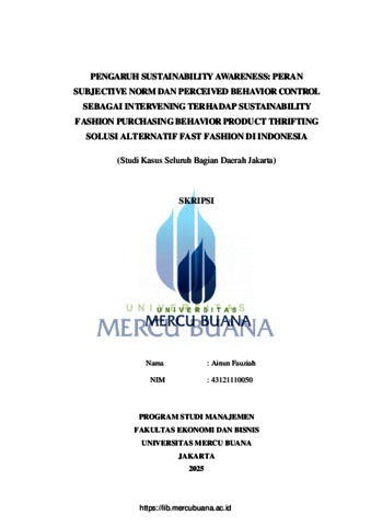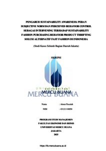 FAUZIAH, AINUN (2025) PENGARUH SUSTAINABILITY AWARENESS: PERAN SUBJECTIVE NORM DAN PERCEIVED BEHAVIOR CONTROL SEBAGAI INTERVENING TERHADAP SUSTAINABILITY FASHION PURCHASING BEHAVIOR PRODUCT THRIFTING SOLUSI ALTERNATIF FAST FASHION DI INDONESIA (Studi Kasus Seluruh Bagian Daerah Jakarta). S1 thesis, Universitas Mercu Buana Jakarta.