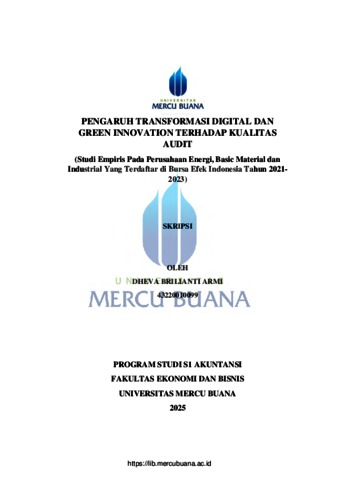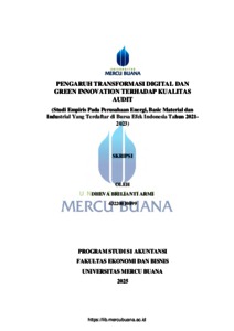 ARMI, DHEVA BRILIANTI (2025) PENGARUH TRANSFORMASI DIGITAL DAN GREEN INNOVATION TERHADAP KUALITAS AUDIT (Studi Empiris Pada Perusahaan Energi, Basic Material dan Industrial Yang Terdaftar di Bursa Efek Indonesia Tahun 2021-2023). S1 thesis, Universitas Mercu Buana Jakarta.