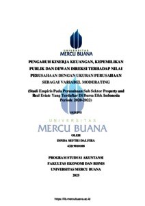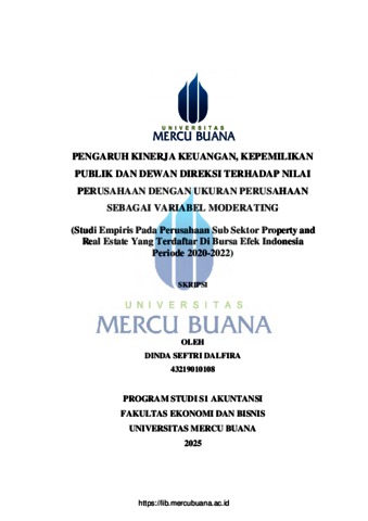 DALFIRA, DINDA SEFTRI (2025) PENGARUH KINERJA KEUANGAN, KEPEMILIKAN PUBLIK DAN DEWAN DIREKSI TERHADAP NILAI PERUSAHAAN DENGAN UKURAN PERUSAHAAN SEBAGAI VARIABEL MODERATING (Studi Empiris Pada Perusahaan Sub Sektor Property and Real Estate Yang Terdaftar Di Bursa Efek Indonesia Periode 2020-2022). S1 thesis, Universitas Mercu Buana Jakarta.