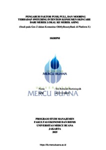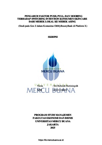 HARTININGSIH, SITI RUBAIAH (2025) PENGARUH FAKTOR PUSH, PULL, DAN MOORING TERHADAP SWITCHING INTENTION KONSUMEN SKINCARE DARI MEREK LOKAL KE MEREK ASING (Studi pada Gen Z dalam Komunitas OhMyBeautyBank di Platform X). S1 thesis, Universitas Mercu Buana Jakarta.