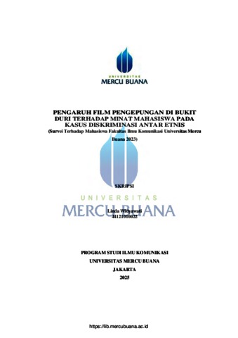 WIDYAWATI, LINDA (2025) PENGARUH FILM PENGEPUNGAN DI BUKIT DURI TERHADAP MINAT MAHASISWA PADA KASUS DISKRIMINASI ANTAR ETNIS (Survei Terhadap Mahasiswa Fakultas Ilmu Komunikasi Universitas Mercu Buana 2023). S1 thesis, Universitas Mercu Buana Jakarta.