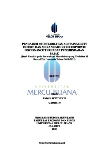 SETYOWATI, ENDAH (2025) PENGARUH PROFITABILITAS, SUSTAINABILITY REPORT, DAN MEKANISME GOOD CORPORATE GOVERNANCE TERHADAP PENGHINDARAN PAJAK (Studi Empiris pada Perusahaan Manufaktur yang Terdaftar di Bursa Efek Indonesia Tahun 2019-2022). S1 thesis, Universitas Mercu Buana Jakarta.