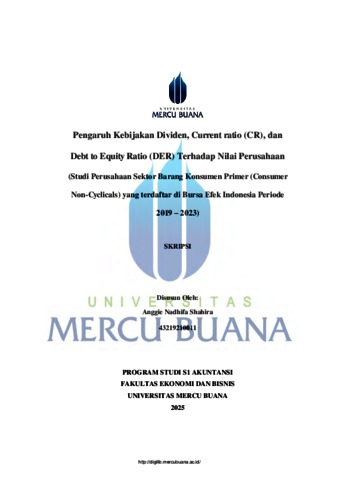 SHAHIRA, ANGGIE NADHIFA (2025) PENGARUH KEBIJAKAN DIVIDEN, CURRENT RATIO (CR), DAN DEBT TO EQUITY RATIO (DER) TERHADAP NILAI PERUSAHAAN (STUDI PERUSAHAAN SEKTOR BARANG KONSUMEN PRIMER (CONSUMER NON-CYCLICALS) YANG TERDAFTAR DI BURSA EFEK INDONESIA PERIODE 2019 – 2023). S1 thesis, UNIVERSITAS MERCU BUANA - BUNCIT.