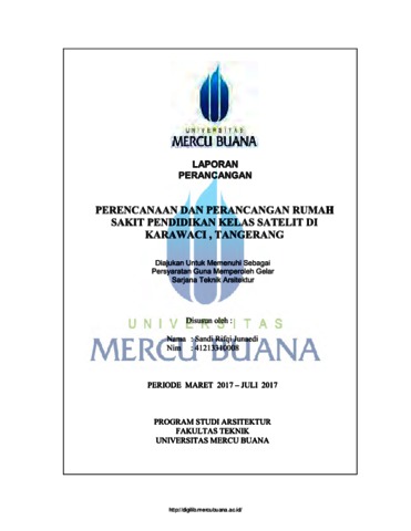 JUNAEDI, SANDI RIFQI (2017) PERENCANAAN DAN PERANCANGAN RUMAH SAKIT PENDIDIKAN KELAS SATELIT DI KARAWACI, TANGERANG. S1 thesis, UNIVERISTAS MERCU BUANA - BUNCIT.