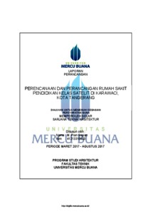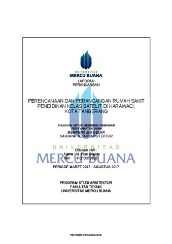 SOPIAN, M. PIAN (2017) PERENCANAAN DAN PERANCANGAN RUMAH SAKIT PENDIDIKAN KELAS SATELIT DI KARAWACI, KOTA TANGERANG. S1 thesis, UNIVERISTAS MERCU BUANA - BUNCIT.