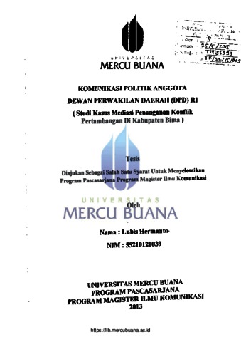 HERMANTO, LUBIS (2013) KOMUNIKASI POLITIK ANGGOTA DEWAN PERWAKILAN DAERAH (DPD) RI (Studi Kasus Mediasi Penanganan Konflik Pertambangan Di Kabupaten Bima). S2 thesis, Universitas Mercu Buana Jakarta.