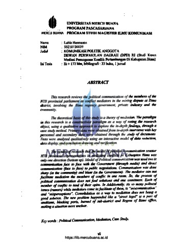 Penelitian ini mengkaji komunikasi politik yang dilakukan oleh Anggota DPD RI perwakilan Propinsi NTB sebagai mediator konflik pertambangan yang terjadi Di Kabupaten Bima, yang melibatkan pihak Pemerintah Kabupaten Bima, swasta, dan masyarakat. Tujuan penelitian mencari tahu komunikasi dan model komunikasi politik dalam proses mediasi yang dilakukan oleh Anggota DPD RI perwakilan Propinsi NTB. Landasan teoritik dari penelitian adalah teori mediasi. Paradigma dalam penelitian adalah paradigma konstruktivis, menggunakan pendekatan kualitatif, melalui metode studi kasus untuk mencari kekhususannya. Data primer diperoleh dari informan kunci melalui wawancara mendalam dan observasi berperan serta, sedangkan data sekunder diperoleh melalui studi dokumen. Data dianalisis secara kualitatif menggunakan model interaktif yaitu mereduksi data, display data, serta penarikan kesimpulan dan verifikasi. Hasil penelitian menunjukkan bahwa model komunikasi politik Anggota DPD RI perwakilan Propinsi NTB dalam memediasi konflik pertambangan di Kabuapten Bima hanya bersifat satu arah yaitu dari bawah ke atas (bottom up). Model komunikasi politik yang digunakan ada dua yaitu komunikasi secara tatap muka (face to face) kepada pihak Pemerintah (namun cenderung melalui media) dan komunikasi tatap muka secara langsung (face to face) kepada masyarakat dalam ranah negosiasi. Komunikasi yang dilakukan cenderung tajam (pihak masyarakat) dan tumpul (pihak Pemerintah). Mediator tidak mampu mempertemukan pihak-pihak dalam lingkup ruang mediasi. Sehingga proses komunikasi politik tidak menghasilkan solusi dan titik temu. Pihak-pihak yang bertikai cenderung mempertahankan pendapat masing-masing. Tambahan lagi banyaknya isu-isu politik yang berkembang dengan hadirnya mediator yang akhirnya makin menimbulkan miscomunikasi dan mispersepsi. Konsolidasi sebagai jalan mediasi menyelesaikan masalah tidak menjadi solusi. Masalah baru tindakan "hukum jalanan" yaitu anakisme, pemblokiran pelabuhan, pembakaran kantor camat, dan kantor Bupati Kabupaten Bima, malah semakin memperkeruh suasana.